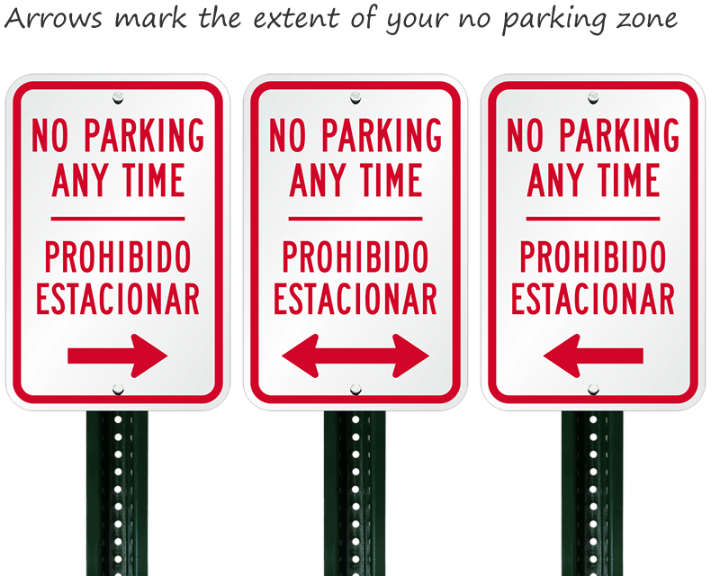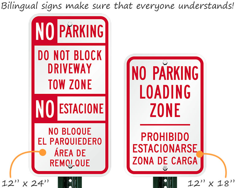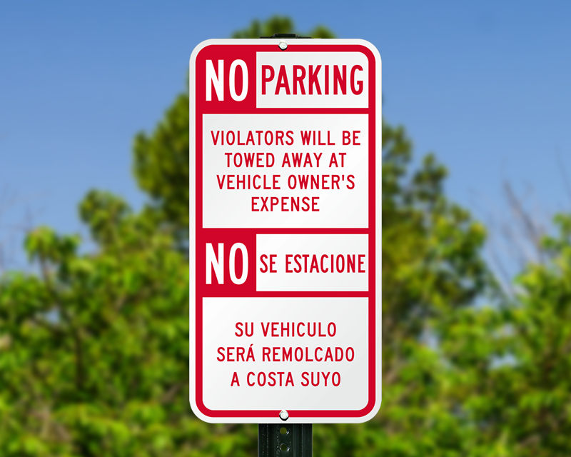 The most common combination is English and Spanish ("No Parking" / "Prohibido Estacionar"), but signs can also be found or customized in English/French, English/Chinese, etc., depending on the neighborhood.