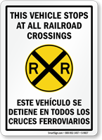 Use a "this vehicle stops at all railroad crossings" sign to notify motorists about the specific driving rules your truck has to follow in both English and Spanish.