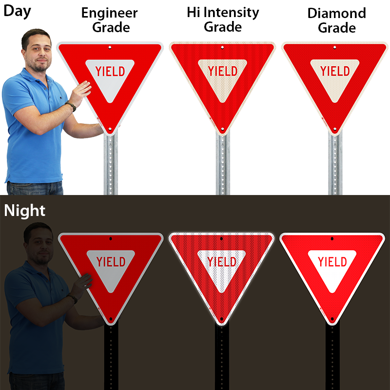All yield signs on public roads are retroreflective, meaning they bounce light back toward its source. When your headlights hit a yield sign at night, the sign appears to glow brightly, making it visible from several hundred feet away. This retroreflective sheeting is a federal requirement for traffic control devices.