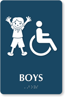 Yes, they are available with raised icons, Grade 2 Braille, and tactile text to meet all accessibility standards for school buildings. Under federal law, restrooms in public schools must be identifiable by all students, making accessibility signs with braille a requirement for permanent bathroom installations.