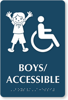 Yes, they are available with raised icons, Grade 2 Braille, and tactile text to meet all accessibility standards for school buildings. Under federal law, restrooms in public schools must be identifiable by all students, making accessibility signs with braille a requirement for permanent bathroom installations.