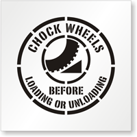 Per OSHA 1910.178, chocks prevent trucks from rolling away during loading. You can find these mandatory markers in our chock wheels signs collection.