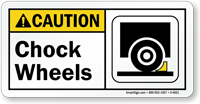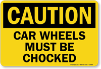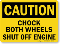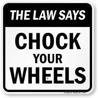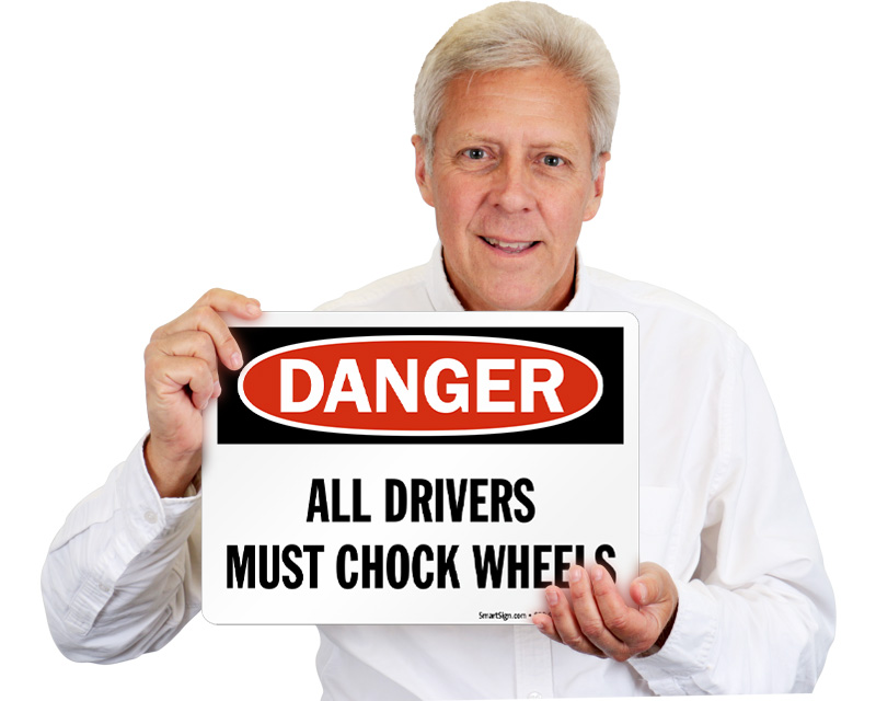 Per OSHA 1910.178, chocks prevent trucks from rolling away during loading. You can find these mandatory markers in our chock wheels signs collection.