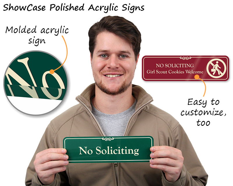 Our projecting no soliciting signs are printed on two sides and make the perfect option for passages and hallways. Choose from Spot-a-Signs™ and V-shaped Acrylic Signs. You may also explore our classy no soliciting desk signs, available in ShowCase and Engraved Table-top Tent styles.
