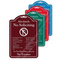 We also offer customizable no soliciting signs that let you add your own words to the sign. Additionally, our no soliciting SignatureSigns range is another stylish option to keep your premises free of solicitors. These are available in different shapes, formats, and colors.