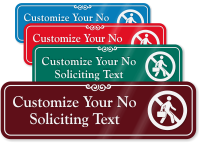 While you may choose any of our no soliciting door signs for your facility, there are a few options that may be more suitable for commercial or professional settings. These include our indoor and outdoor no soliciting engraved plates that are available in as many as 16 colors with options to personalize your sign!