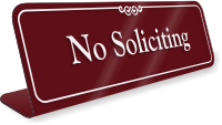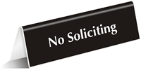 Our projecting no soliciting signs are printed on two sides and make the perfect option for passages and hallways. Choose from Spot-a-Signs™ and V-shaped Acrylic Signs. You may also explore our classy no soliciting desk signs, available in ShowCase and Engraved Table-top Tent styles.