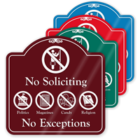 We also offer customizable no soliciting signs that let you add your own words to the sign. Additionally, our no soliciting SignatureSigns range is another stylish option to keep your premises free of solicitors. These are available in different shapes, formats, and colors.