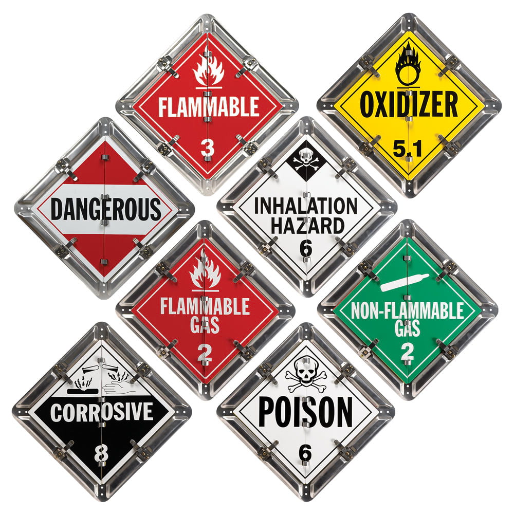 Truckers favorite! This is our most popular placard set. Flip between eight common DOT hazard panels and then lock it all down with the industry’s best spring clips.