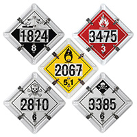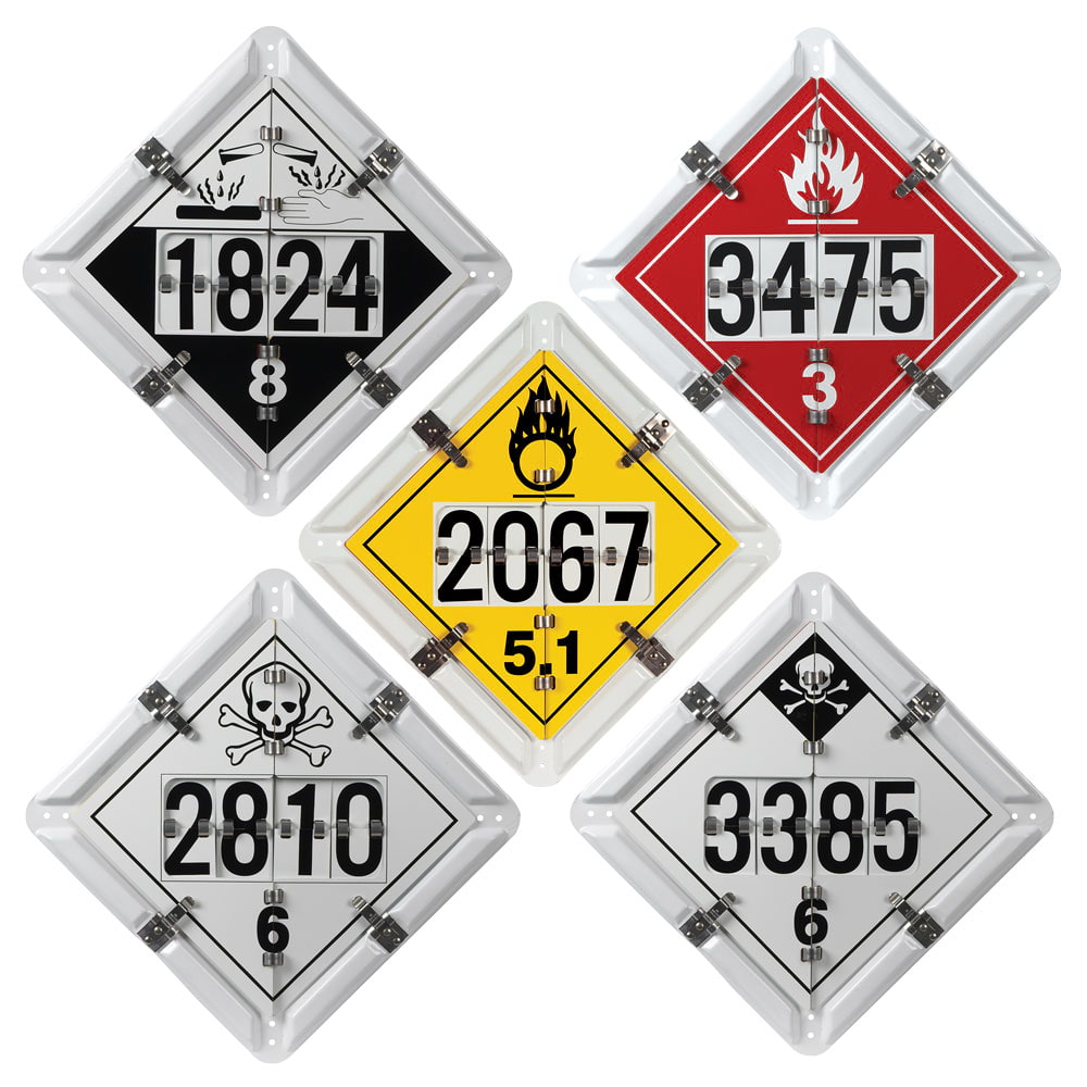 Durable placard sets contain multiple screen-printed legends that meet DOT specifications and numbers to show the UN/NA classification.