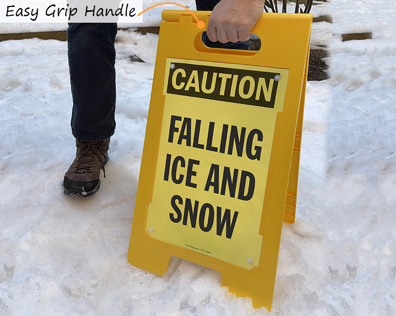 Yes, our FloorBoss kit versions of falling snow warning signs include a floor-standing frame with two interchangeable sign panels, ideal for temporary deployment at building entrances and sidewalks during active winter weather and easy to store when conditions improve and the hazard passes.