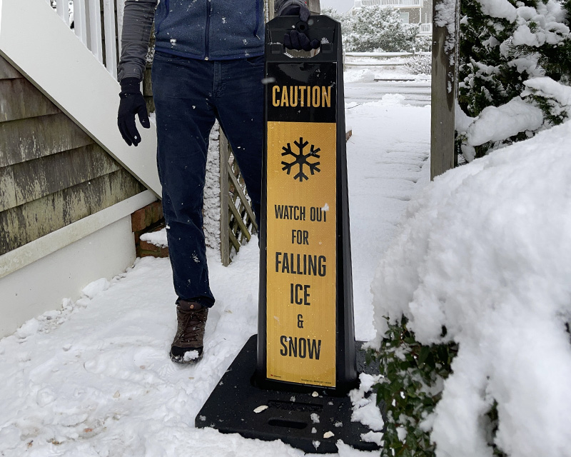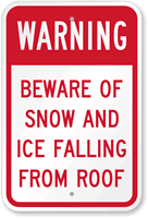 Property owners and managers have a duty to warn visitors of known hazards including falling ice and snow from rooftops, and our falling snow warning signs help fulfill this duty and reduce liability in slip-and-fall and falling ice injury claims, popular with landlords, property managers, and building owners in northern climates during winter months.