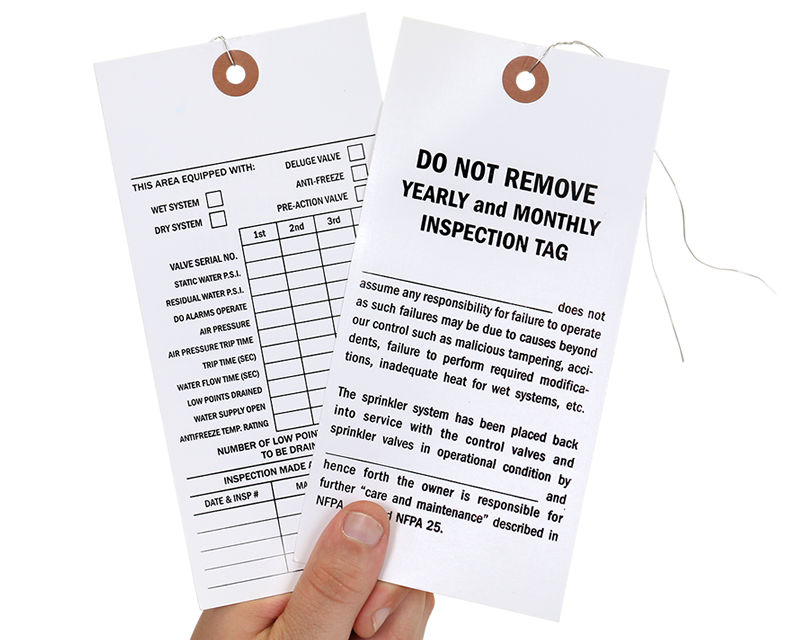 It is required by your fire marshal to have a weather-proof, durable tag to mark the inspection of your Fire Sprinkler Inspection system. That's why our signature Fire Sprinkler Tags can be used for a variety of sprinkler systems, including those that use a "wet" system, a "dry" system, use deluge valves or anti-freeze. No matter what kind of system you have, you need a thorough and lasting record of inspections, so you can prove that you're ready for a fire emergency. Get the job done with the best selection of fire sprinkler tags in the business.