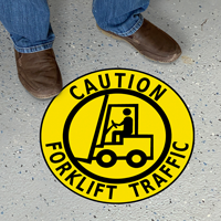 Yes, our forklift floor signs in SlipSafe format and floor marking tape mark forklift traffic lanes, pedestrian crossings, and intersection boundaries at ground level throughout warehouse and manufacturing floors, complementing wall and overhead forklift traffic signs to create a comprehensive visual traffic management system that communicates lane rules and pedestrian separation from every direction.