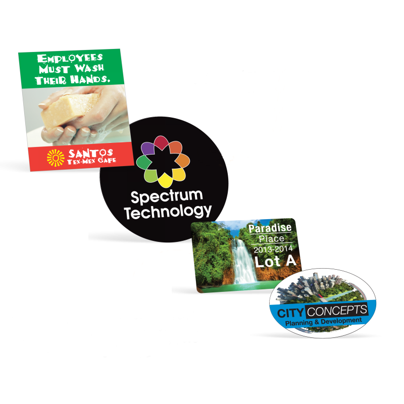 - Material options include vinyl, polypropylene, static cling, and of course, paper. Choose from different grades of adhesive, including permanent and removable.