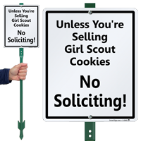 We have just the signs for you! You can order signs that clearly state “Children Welcome Otherwise No Soliciting”, “No Soliciting Except Kids”, or “No Soliciting Unless You're Selling Girls Scout Cookies!”. You can also be more specific with signs like “No Soliciting Unless You're Selling Thin Mints!”. These signs are a courteous way to refuse entry to all others except girls scouts and children going door-to-door for a noble cause. Even better, feel free to create your own customized no soliciting sign, at no extra cost, to send out the exact message you want.