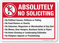A quirky message will get the point across quicker! Prohibit soliciting at your home, office, store or building with Funny No Soliciting Signs that arrive straight to the point. A sarcastic punch or a clever message is all it takes to make sure solicitors get your no soliciting request.