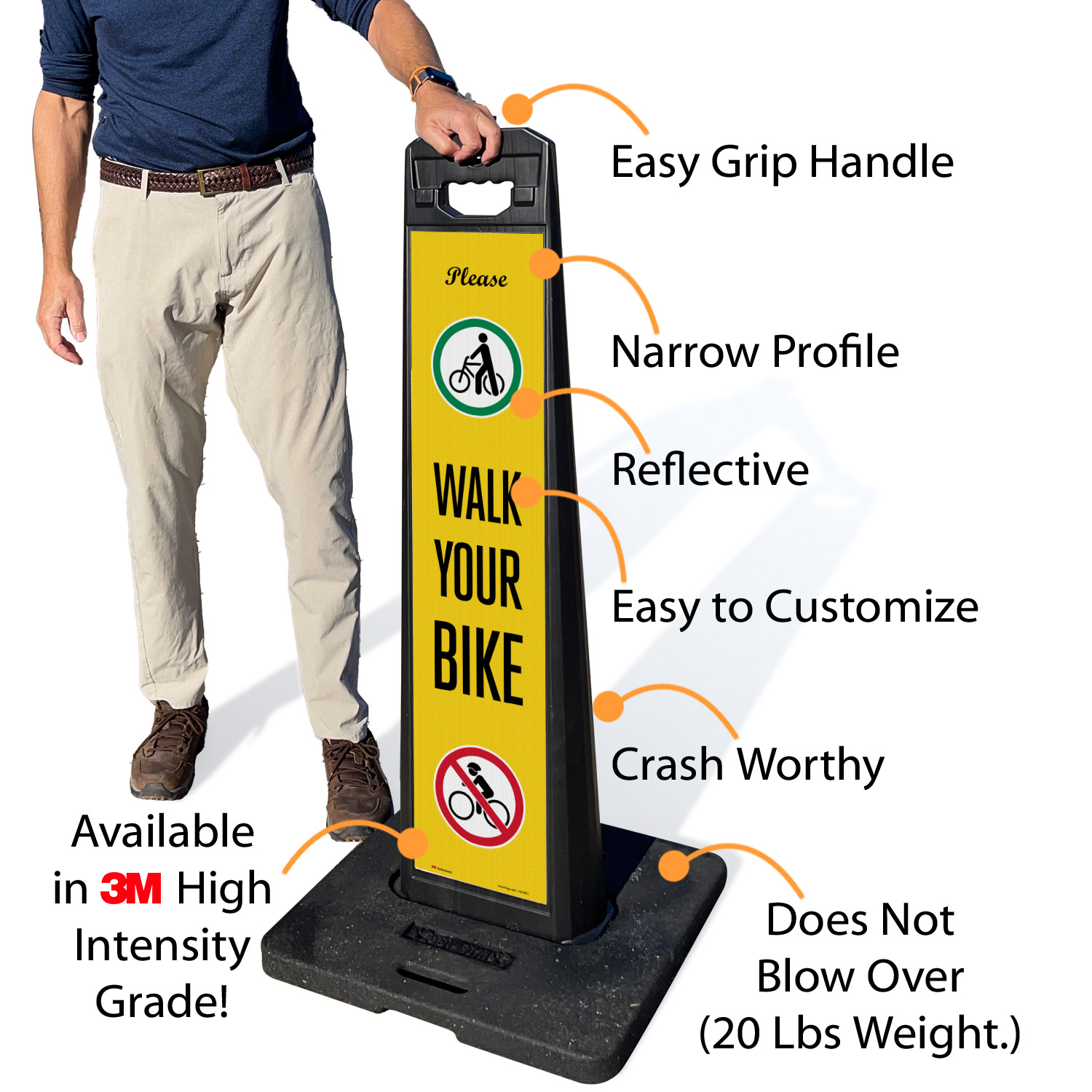 • Sign panel and base are stackable for compact storage.