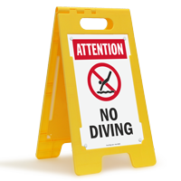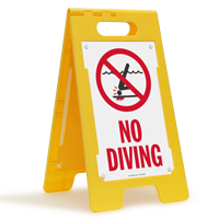A. Designed to bring together high visibility and ultimate convenience, our readily portable “No Diving” FloorBoss signs are two-sided. The signs come as kits containing two sign panels and a lightweight yet sturdy yellow frame that the panels slide into. You may choose from standard and reflective panels to convey your message to passersby approaching from opposite directions.