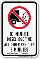 Most no idling ordinances allow 3–5 minutes of idling before a violation occurs, though exact limits vary by location. Some school and hospital zones reduce this to 1–2 minutes. In cold or hot weather, exceptions may allow longer idling for temperature control. Signs like the 3-minute idling law sign help communicate clear local regulations.