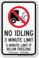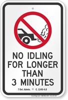 Most no idling ordinances allow 3–5 minutes of idling before a violation occurs, though exact limits vary by location. Some school and hospital zones reduce this to 1–2 minutes. In cold or hot weather, exceptions may allow longer idling for temperature control. Signs like the 3-minute idling law sign help communicate clear local regulations.
