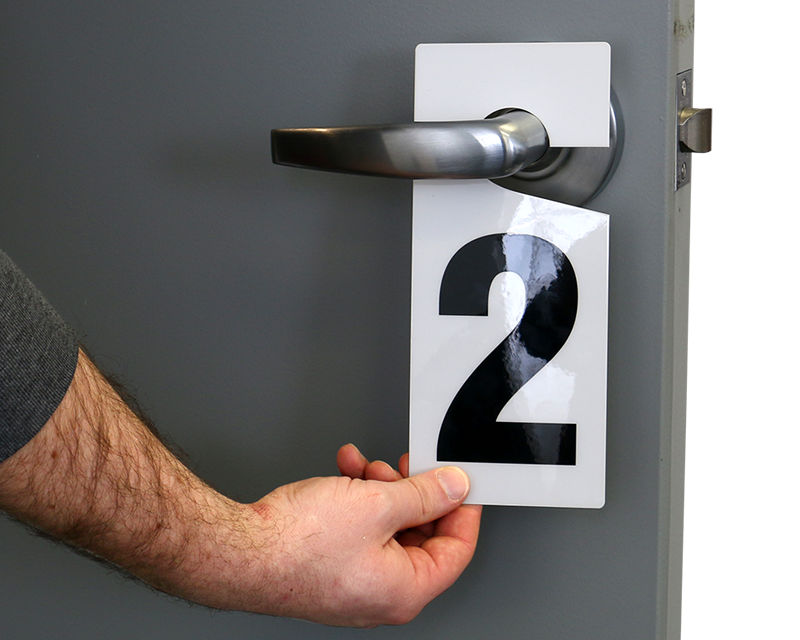 Easy-to-hang and easy-to-remove, Numbered Door Knob Tags give you the flexibility to mark a door when identification is required or change the tags when room numbers are changed, without having to remove any hardware like in case of wall signs. Numbers are large enough to be spotted from afar.