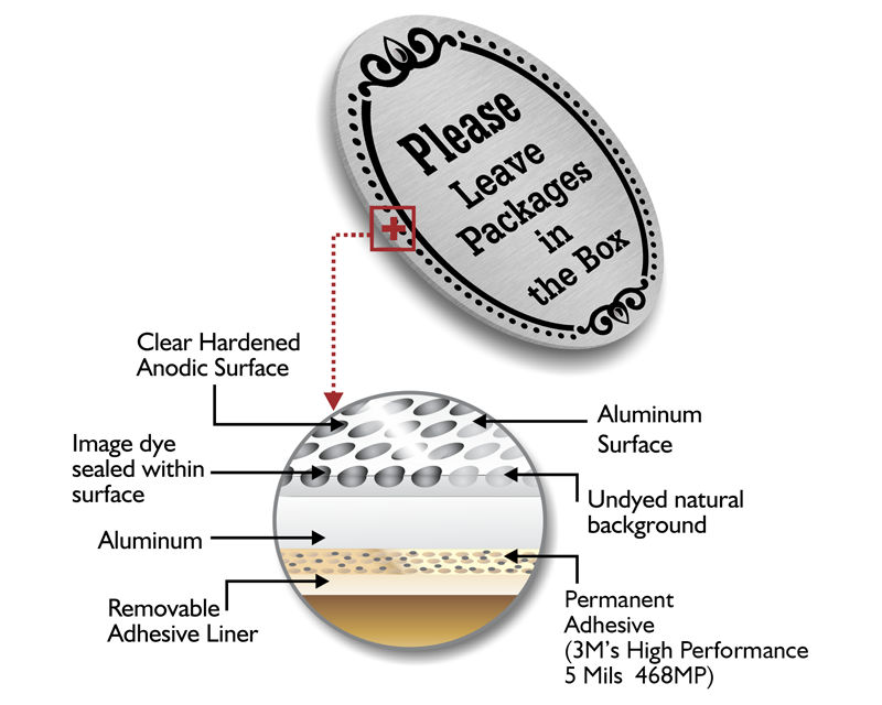 • • Our anodized aluminum DiamondPlate™ signs can easily be mounted with screws or their aggressive adhesive backing. Their elegant appearance is perfect for residential use. Their subsurface printing ensures they wont scratch or fade.