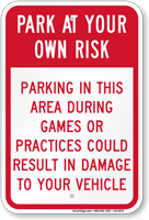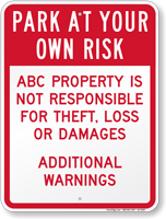 A simple sign can save you and your drivers many thousands of dollars. Alert drivers to parking risks in unsafe or unsecured areas. Use park at your own risk signs to prevent accidents, explain damages, and reduce your liability. Use for hotel, church or store parking lots. Protect against theft, careless drivers, snow… even foul balls.