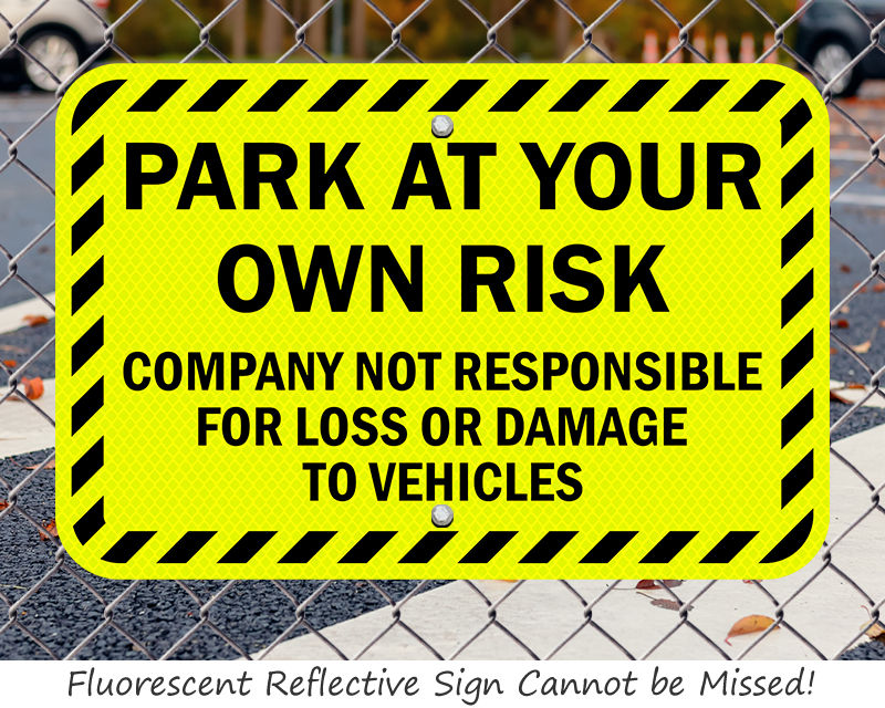 A simple sign can save you and your drivers many thousands of dollars. Alert drivers to parking risks in unsafe or unsecured areas. Use park at your own risk signs to prevent accidents, explain damages, and reduce your liability. Use for hotel, church or store parking lots. Protect against theft, careless drivers, snow… even foul balls.