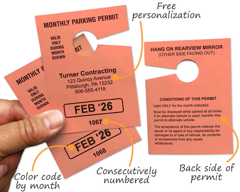 Our Monthly Parking Permit Passes are made from 10 pt cardstock and designed to fit over a broad range of rearview mirrors. These are temporary in nature and not recommended for extended outside use.