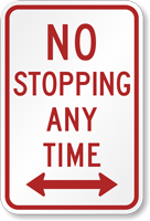 A no stopping sign means vehicles cannot stop at any time in that zone, not even briefly to drop off passengers, and our no stopping any time sign is a clear, standard-format option in reflective aluminum widely used in fire lanes and restricted access zones on private and commercial properties.