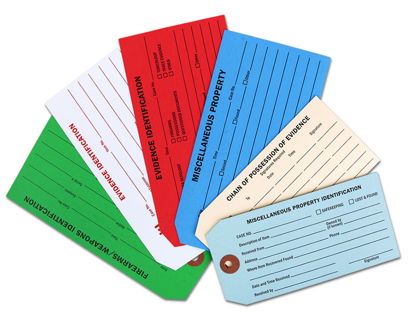 • Our Police Evidence Tags are the premier means for identification at crime scenes, manufactured in small, manageable sizes and a variety of colors, from standard and neutral to bright and eye-catching.