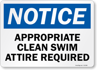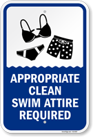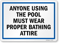 Proper swim wear generally means clothing specifically designed for swimming (swimsuits, trunks, rash guards). street clothes, cotton t-shirts, jeans, and "cut-offs" are typically prohibited. This rule is enforced via proper swim wear required signs.
