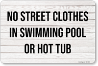 Cut-off jeans are prohibited because the frayed edges shed rapidly, clogging pumps. metal rivets on jeans can also scratch water slides or pool surfaces. You can include this specific warning on custom swimming pool signs.