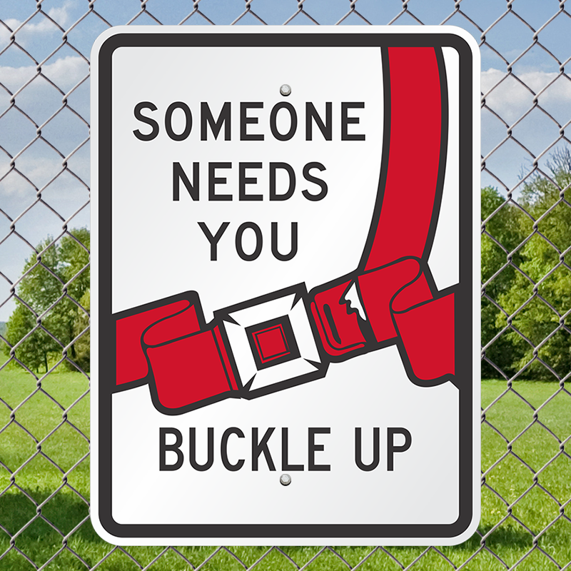 Seat Belt Safety Sign: Someone Needs You Buckle Up With Graphic K-0006 Learn More...