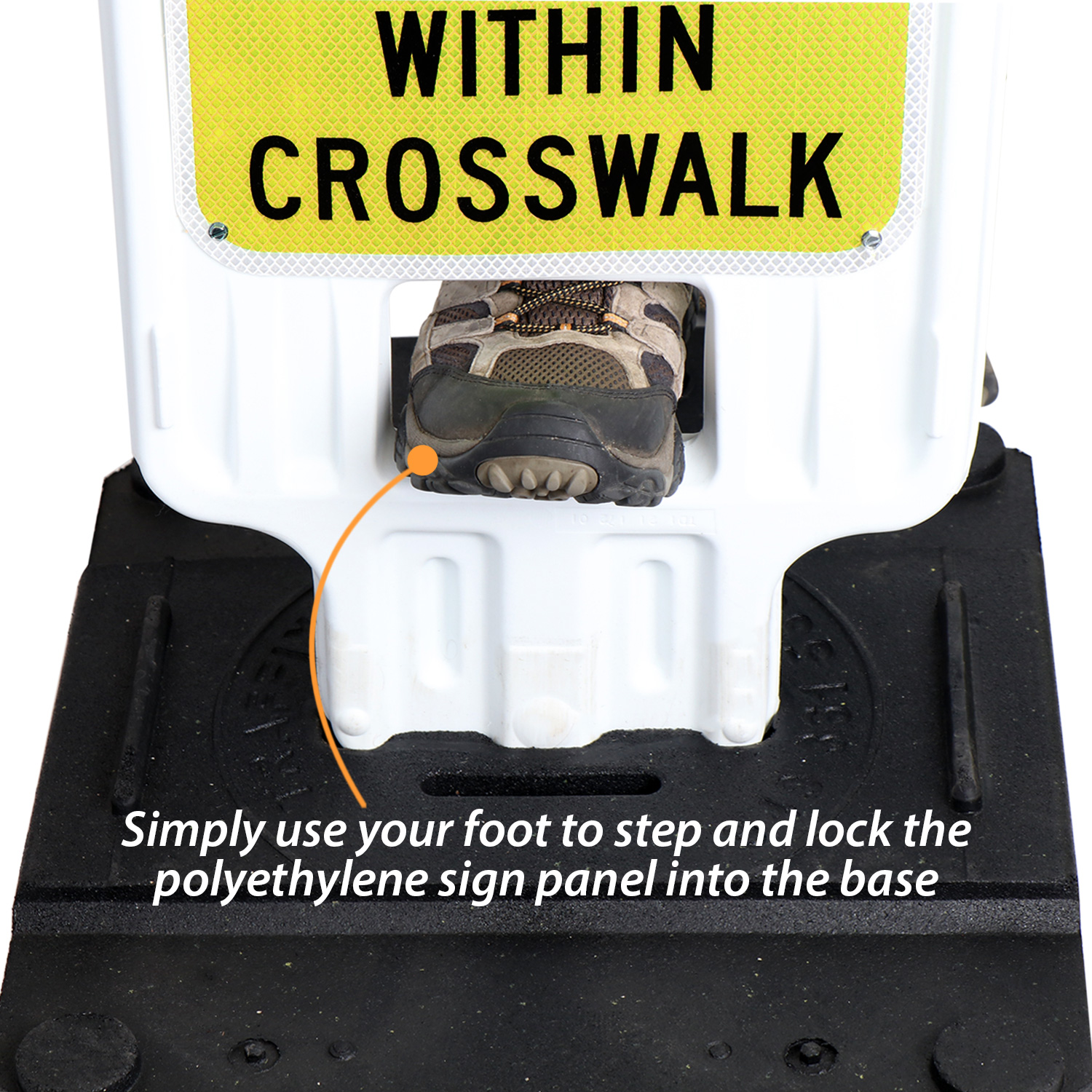 Simply step into the foot hole and lock the panel into the rubber base on this impact resistant portable sign.