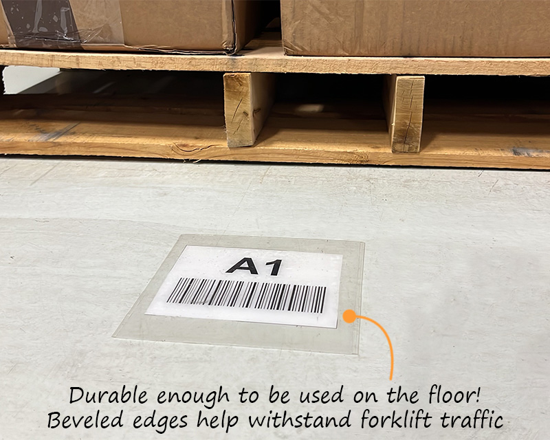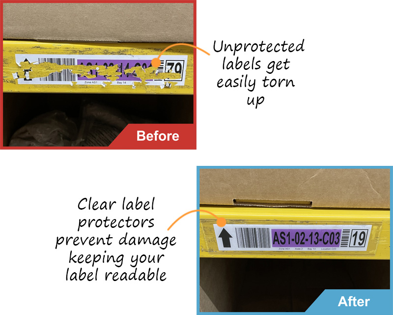 • • Perfect for labels on warehouse shelves. Label protectors are even durable enough to be put on the floor! Clear label protectors can withstand abuse from forklifts and heavy foot traffic.