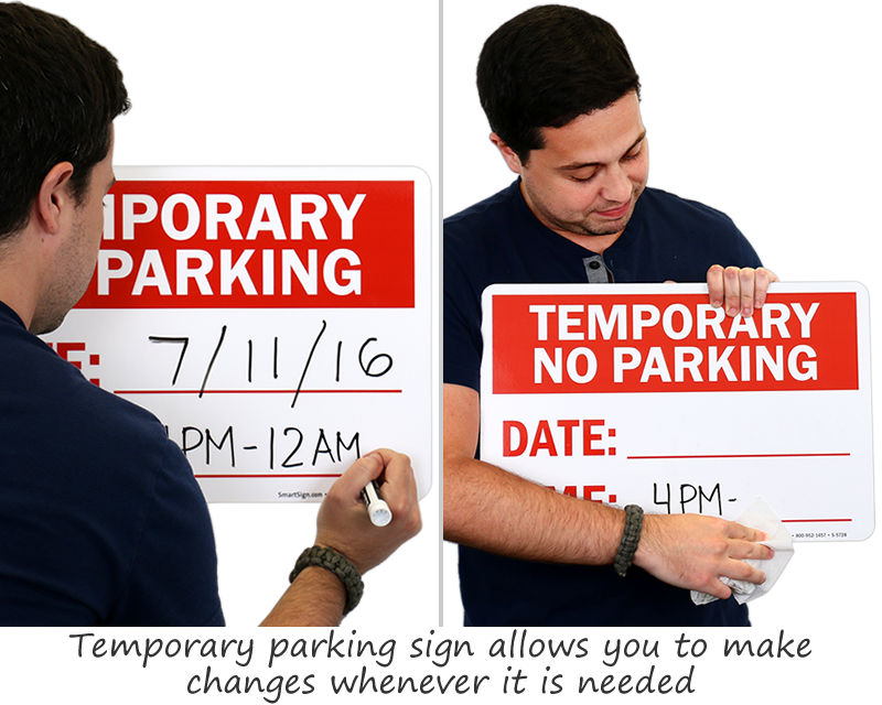 • • Most parking signs have a writable and erasable surface for your temporary messages. Mention date and time of no parking or towing details using a non-permanent ink marker or grease pencil.