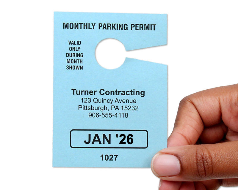 Parking permits specifically created hang conveniently on your vehicles rear-view mirror fall under the category of hang tags. It can be a hook or claw shape, or mirror cut-outs, that easily loop over the mirror, but stay in place once attached. These can be taken on and off easily, and are great for temporary use.