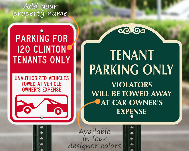Keep your parking lot free of unauthorized cars. Our tenant parking signs identify and reserve parking for people who work or live at your property and pay rent! Choose a design below or start with a custom template.